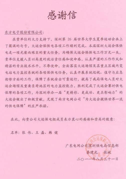 8月23日,世界大学生运动会在深圳圆满落幕,北京中科唯佳科技有限公司作为大运会唯一保电企业见证了世界大学生体育运动的蓬勃发展。北京中科唯佳科技有限公司技术中心系统部与工程部坚守“忠于职守,全力以赴,誓保大运电网安全”的信念,联手实现了大运保供电期间系统零故障、零缺陷的目标。